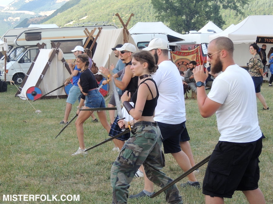 Montelago, però, è anche tanto altro. Ci sono moltissimi stand per acquistare oggettistica di tutti i tipi, i divertenti giochi celtici, i corsi di strumenti tradizionali come violino, cornamusa scozzese e iberica, tin whistle, arpa celtica, organetto, chitarra acustica, bouzouki e percussioni, le interessanti conferenze nella tenda Tolkien, i corsi di artigianato, i matrimoni celtici (noi qui ci siamo sposati per la prima volta nel 2013, esattamente dieci anni fa, quindi siamo legatissimi a MCF), il campo storico con tanto di scontri e rievocazione di battaglie, attività legate alla cucina fantasy e medievale, falconeria, arceria e le sempre frequentatissime danze celtiche/irlandesi. Ce n’è veramente per tutti i gusti e il problema, semmai, sta nel dover scegliere cosa fare o vedere nel tempo che si ha a disposizione. Non mancano, ma è facile immaginarlo, stand per mangiare e bere, con una grande scelta per tutti i palati e le filosofie alimentari. Noi ci siamo abbuffati con un doppio english breakfast, tante patate fritte da rendere fiero Samvise Gangee, Varnelli, sidro alla mela e alla pera, il famoso “paccatello” marchigiano, un paio di panini offerti da amici e vini speziati: da veri hobbit quali siamo abbiamo fatto il nostro dovere!